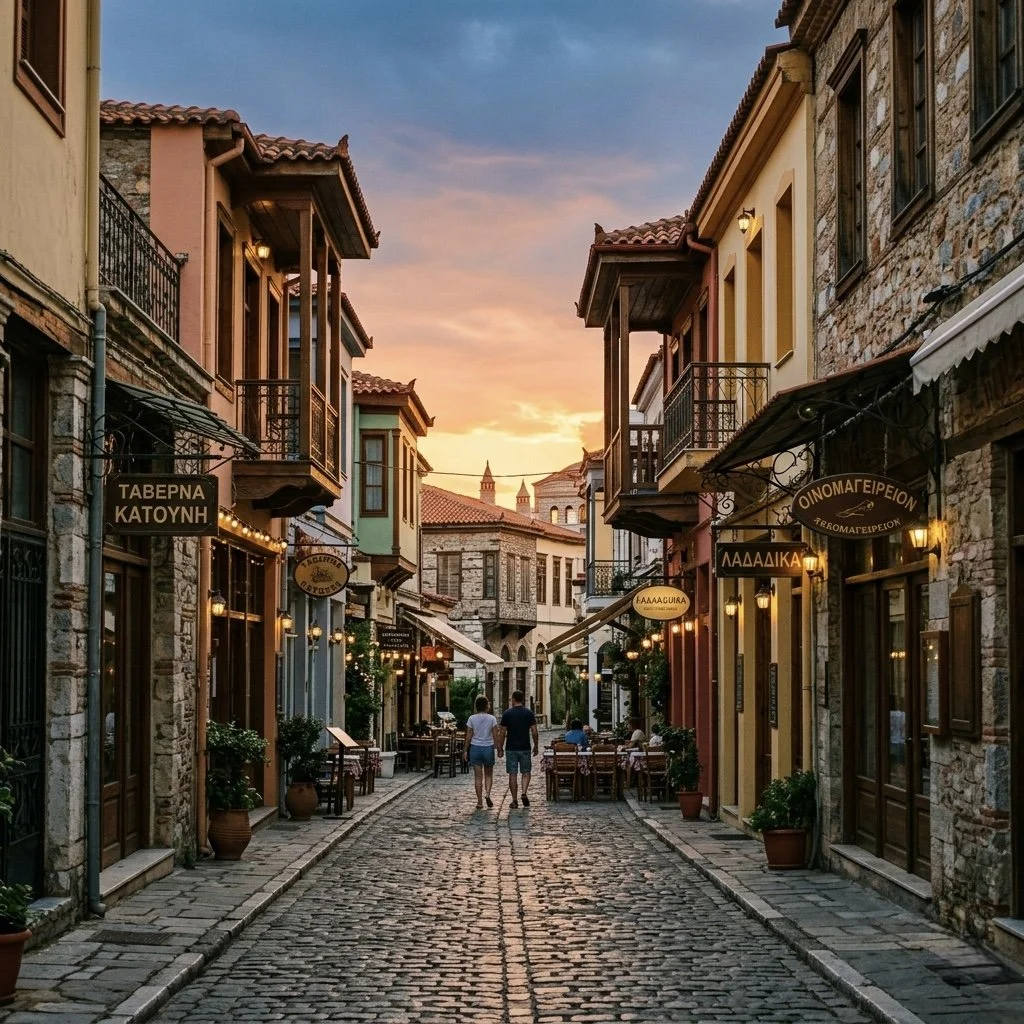 Le quartier de Ladadika s’illumine et devient un lieu parfait pour dîner en famille : tavernes animées, musique, ambiance conviviale 🍽️