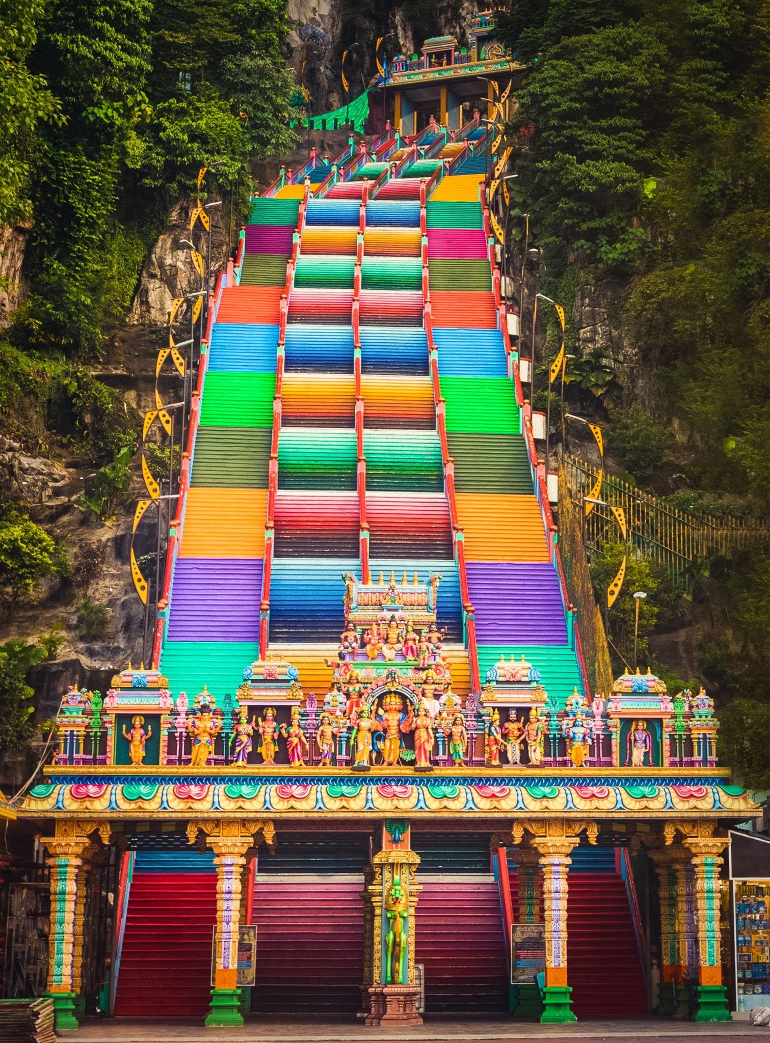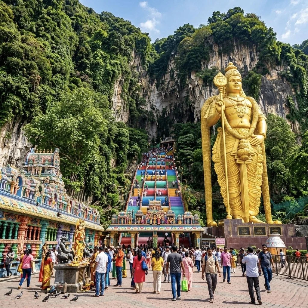 Les célèbres Batu Caves, avec leurs marches colorées et leur statue monumentale, offrent une expérience impressionnante 🪔